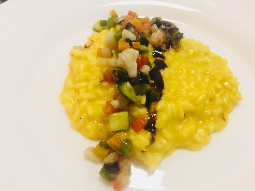 Poi , infatti, ci si è messi a tavola: per gli antipasti. Ouverture per Simone Cappilli con fiore di zucca con avocado, burrata di Andria, gazpacho di sedano e datterino, gambero viola di Gallipoli: poi la palla è passata a Mimmo Persano con seppia al profumo di timo, porro, purea di fave, Chardonnay, pomodorino di Torre Guaceto e cialda croccante di pane; cavalcata verso i primi di Gabriele Castiello con maltagliati integrali fatti in casa con pescatrice al finocchietto, concassé di pomodoro al basilico fresco e zeste di limone candito; lancio verso la porta a cinque piedi, anzi mani (Persano, De Luca, Cappilli, Castiello e mise en plat di Donato sposo in persona), per il risotto Carnaroli Riserva San Massimo con pistilli di zafferano, aceto balsamico tradizionale di Modena extravecchio di Giuseppe Giusti e vegetali; assist di Alfredo De Luca con filetto di vitello all’uva fragola, insalatina di stagione, millefoglie di patate; gol di Paolo Barrale con i dessert, ovvero pane con cioccolato, olio e mandarino. Vini di ogni ordine e grado by L’Astore.