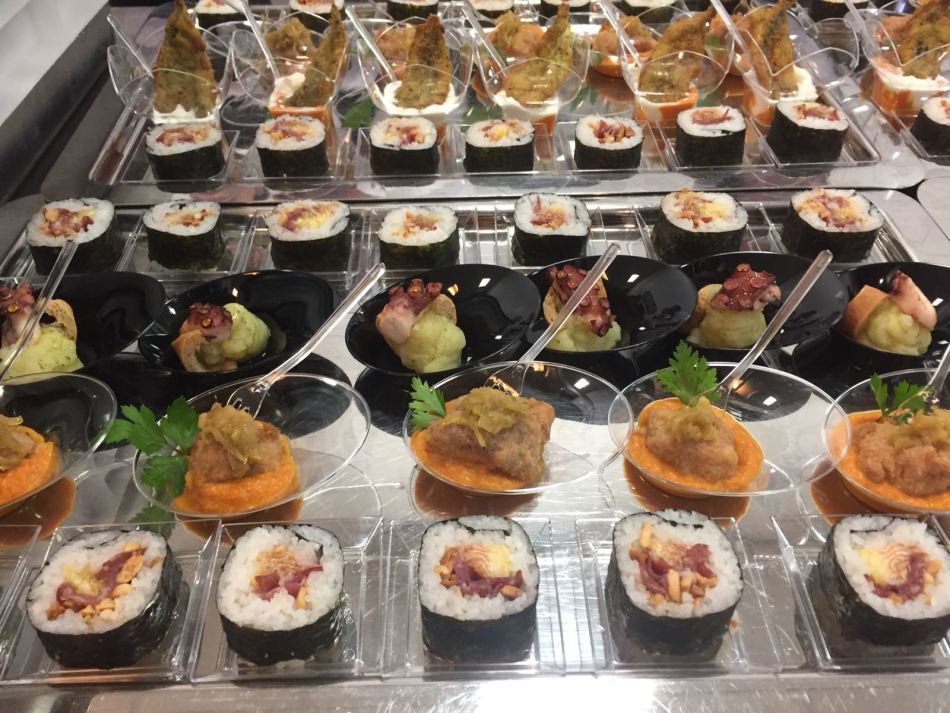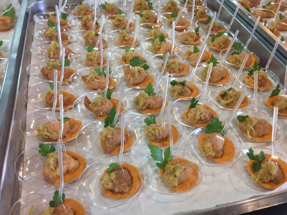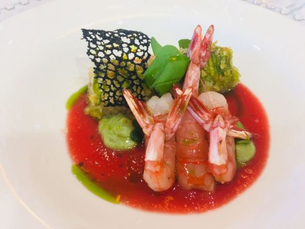 Apertura di ricevimento non in giardino, come inizialmente stabilito, per le avverse condizioni meteo (non la pioggia prevista, ma un maestrale fortissimo), e entrée firmate dai vari chef all’opera: ‘mpepata di cozze e frisa con tonno e Yuzukoshō (salsa a base di yuzu e soia) per Paolo Barrale; sushi salentino con capocollo di Martina Franca, fioroni e mandorle tostate al sale Maldon, frisellina d’orzo con polpo alla griglia, schiacciata di patate al prezzemolo e limone, rotolo di trota salmonata marinata agli agrumi, caprino e insalatina di asparagi per Mimmo Persano; mazzancolla, gelatina di pomodoro, limone bruciato e cialda di alghe e cannolo di riso farcito con parmigiana di melanzane, crema di caciocavallo e pomodoro arrosto per Alfredo De Luca; insalatina di sgombro marinata al miso, miglio e cipolla in agrodolce più lecca-lecca di pomodoro e mozzarella di bufala, basilico e barbabietola per Simone Cappilli; il resident chef ha invece optato per alici in panure verde aromatica, sala di peperoni in agrodolce e stracciatella, e poi acquasale al basilico fresco, maialino in carpione, porro e liquirizia. Infine un piatto voluto dallo stesso sposo, ovvero tapas di cipolle rosse di Acquaviva e ceci neri di Zollino e mantecato di merluzzo.