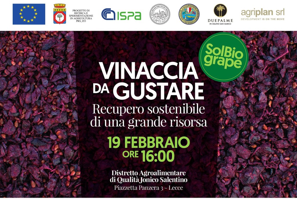 “Vinaccia da gustare – Recupero sostenibile di una grande risorsa” è il tema dell’incontro in programma martedì 19 febbraio alle 16 a Lecce, presso il Distretto Agroalimentare di Qualità Jonico-Salentina, per la presentazione del progetto “SolBioGrape”. L’incontro è organizzato dall’Istituto di Scienze delle Produzioni Alimentari del CNR di Lecce (CNR-ISPA) con il sostegno di Regione Puglia, Università di Foggia e di Bari, Cantina Due Palme e Agriplan srl.