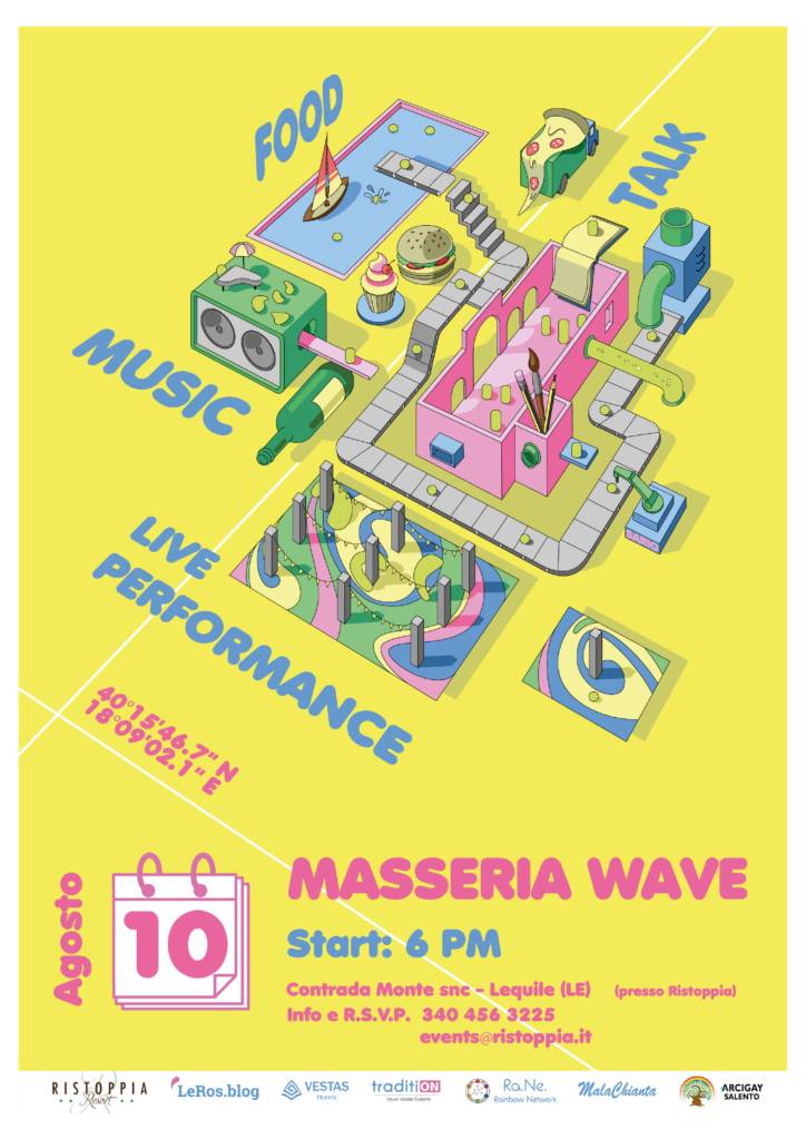 È il messaggio forte, la sfida e l’invito che verranno lanciati sabato 10 agoato da “Masseria Wave”, ideale onda di cambiamento che prenderà forma nell’incantevole Masseria Ristoppia di Lequile, tra food, live perfomance, talk e musica e l’obiettivo di creare una rete di interazioni, scambi di idee e possibili collaborazioni.