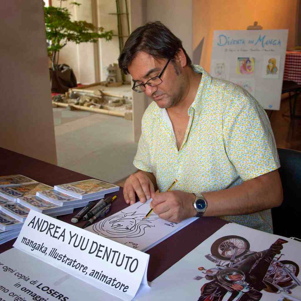 Andrea Dentuto, illustratore e animatore, ha lavorato presso gli studi di animazione della Telecom Film in Giappone, è stato amico personale di Monkey Punch e ha pubblicato manga originali di Lupin III divenendone disegnatore ufficiale. Storiografo dell’opera di Monkey Sensei, è spesso ospite presso le fiere del fumetto dove racconta ai fan dell’opera curiosità e aneddoti dal dietro le quinte ed è insegnante di lingua giapponese per conto dell’associazione Momiji, principale realtà in Puglia di cultura e lingua giapponese. Nel corso degli eventi gastronomici, in compagnia di Ojisan, arricchisce la serata con i racconti tratti dalla sua grande esperienza nel mondo dei manga e degli anime.